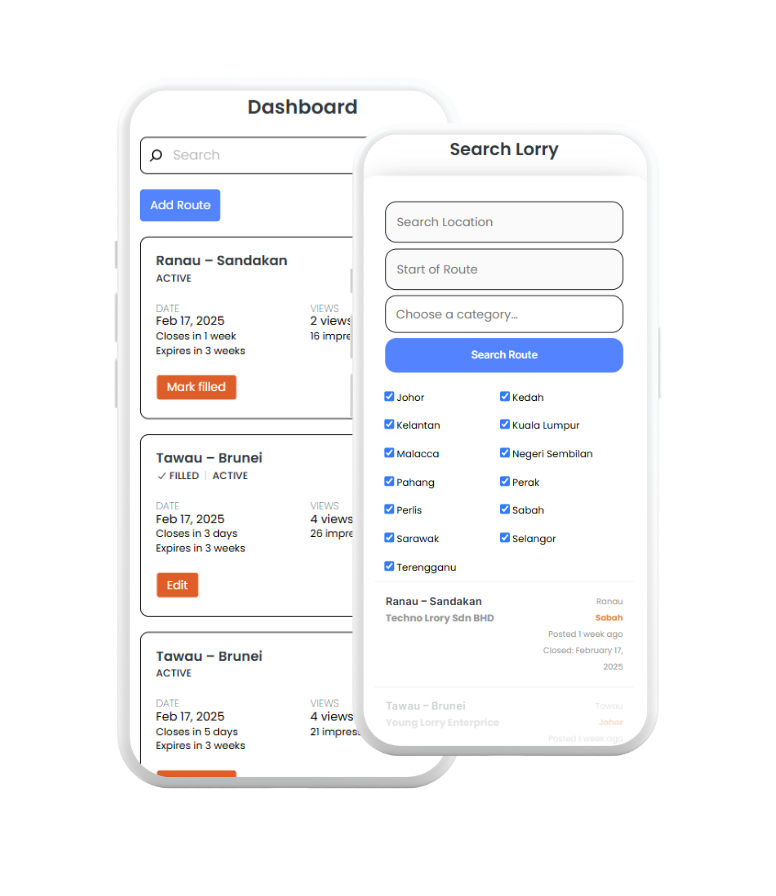 If you own a lorry, list your available routes to connect with clients looking for transport. Post details like your route, lorry type, and contact info to get direct inquiries—no commissions, no hidden fees.
